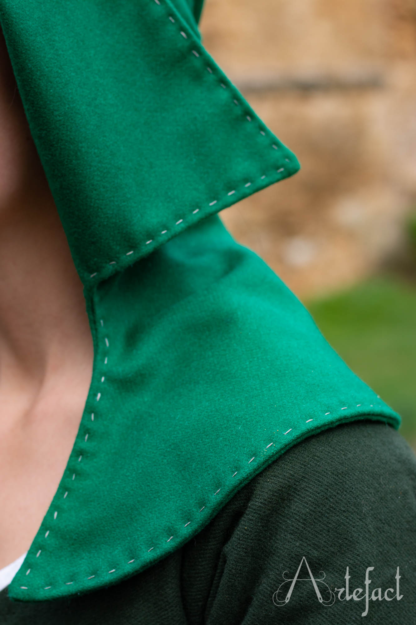 Il possède une longue cornette. On peut s'en servir contre le froid comme écharpe et la nouer autour de la tête (voir photo du chaperon vert).